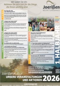 Unser Bestattungshaus wird auch 2026 ein Ort der Begegnung sein. Bei unseren Veranstaltungen und Aktionen ermöglichen wir Ihnen Raum und Zeit für die Dinge, die Ihnen im Leben wichtig sind. Schauen Sie in unseren abwechslungsreichen kulturellen Jahreskalender (auch online verfügbar), den Sie hier in einer Kurzübersicht für 2026 finden: